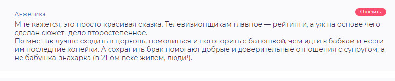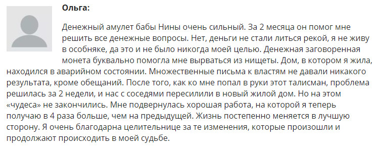Также нужно отметить, что черная магия целительницу не интересует. Иными словами, отомстить обидчику она не поможет. Ясновидящая мотивирует это тем, что свой дар она получила от Бога. И, следовательно, может применять его только на пользу людям.