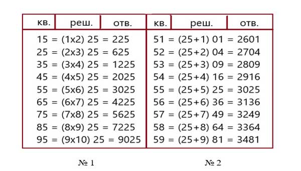 В таблице № 1 первую цифру числа нужно умножить на следующую и добавить к результату 25. Например, 85 х 85 = 7225. Решение: 8 х 9 = 72 (число 9 следует после 8). К 72 добавляем 25 и получим ответ: 7225.