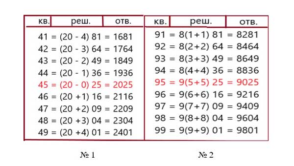 В таблицах № 1 и 2 красным цветом показан алгоритм возведения в квадрат чисел, которые заканчиваются числом 5. К ним привязаны все другие вычисления.