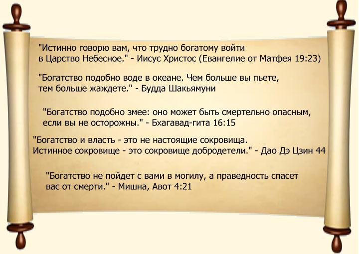 Кстати, вот что говорят о развращающем богатстве (не путать с прочным достатком) разные религии мира: