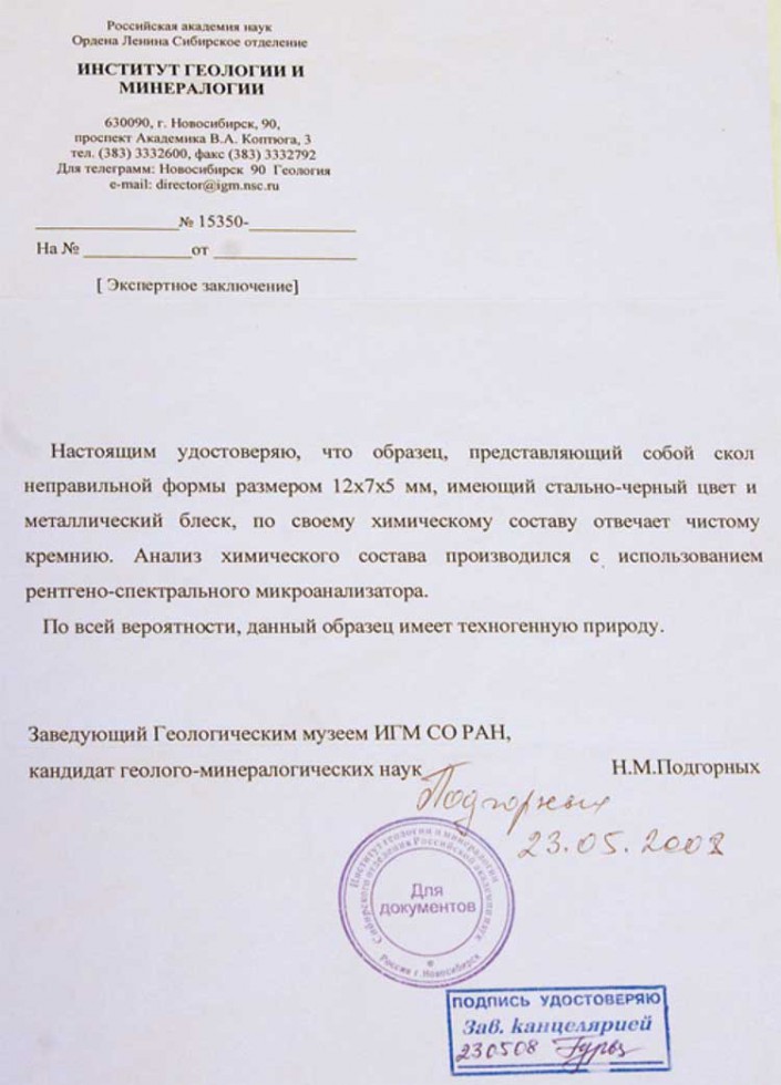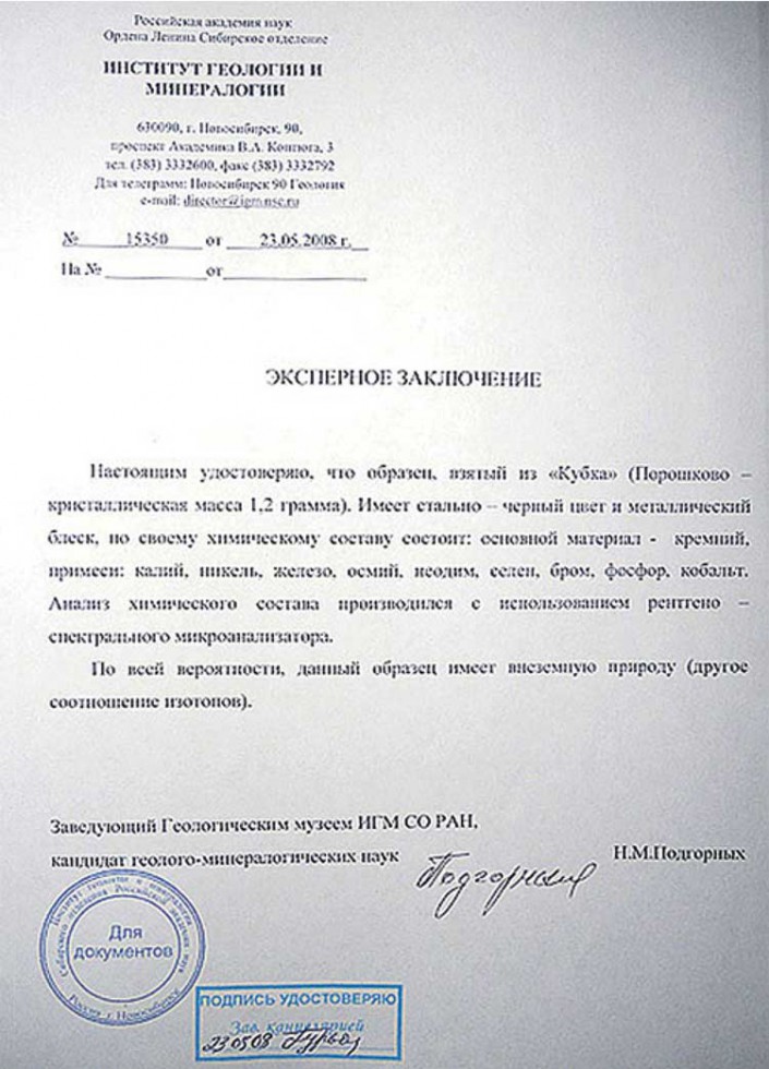 Рентгеноспектральный микроанализ, сделанный в Институте геологии и минералогии Сибирского отделения РАН, до десятых долей процента подтверждает саратовский. Также Виктор Панюшкин, профессор кафедры общей и неорганической химии Кубанского госуниверситета, заверил меня как специалист, что в земных условиях такое соотношение компонентов в сплаве не встречается. А наличие в изделии осмия почти наверняка означает: этот предмет из космоса.