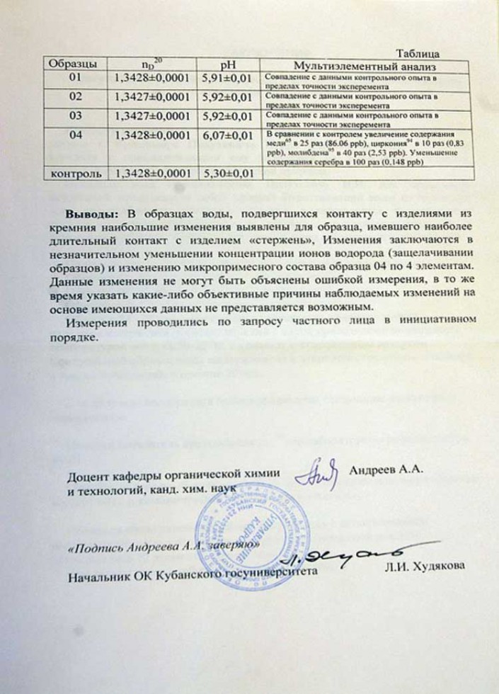 Я обратился в несколько научных учреждений и получил удивительные результаты. Кубок состоит из кремния внеземного происхождения, вторит заключение, выданное в Кубанском государственном университете (КГУ). К столь фантастическому выводу кубанских учёных подтолкнули результаты эксперимента. Якобы, после того как вода 20 часов простояла в кубке, содержание молибдена в ней по каким-то загадочным причинам увеличилось в 40 раз, меди - в 25 раз, циркония - в 10. А серебра, наоборот, стало меньше в 100 раз.