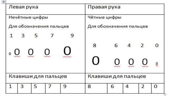 Я полагаю, что у человека может быть 3-й язык – бессознательный. Его парадокс заключается в том, что человек способен выдавать данные об окружающем мире без участия сознания. Этот язык человека закодирован природой, или ещё кем-то, в его десяти пальцах. Он способен выражать бессознательное мнение в любом объёме. Один из методов реализации этого языка показан с помощью прибора на рисунке № 2. Пальцы левой и правой рук обозначаются цифрами (от 0 до 9). У левой руки (от мизинца до большого пальца) они обозначены не чётными цифрами (1-3-5-7-9), а у правой (от большого пальца к мизинцу) - чётными (8-6-4-2-0). Если эти цифры соединить вместе, то получится число: 1357986420. Может быть и любой другой порядок их обозначения. На схеме кончики пальцев изображены знаком 0. Затем все они закрепляются на клавишах, имеющих такие же цифровые обозначения: