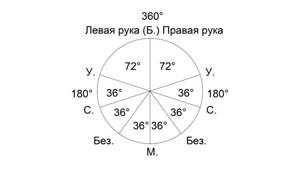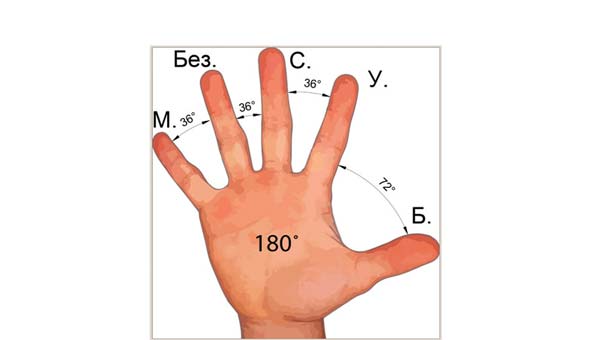А большой угол между указательным и большим пальцами станет двойным (36 + 36) - 72 градуса. Тогда общая сумма всех углов ладони человека будет равна 180 градусам. А у двух ладоней – 360 градусов, то есть окружности.