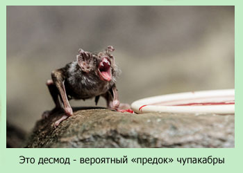 Возможно, что десмод – одна из частей чупакабры. Поэтому чудовище также питается кровью и высоко подпрыгивает. Быстро перемещаться по поверхности земли монстру помогают гены кенгуру. У обезьян были позаимствованы клыки и умение лазать по деревьям. Хотя позднее обезьяна была заменена собакой.
