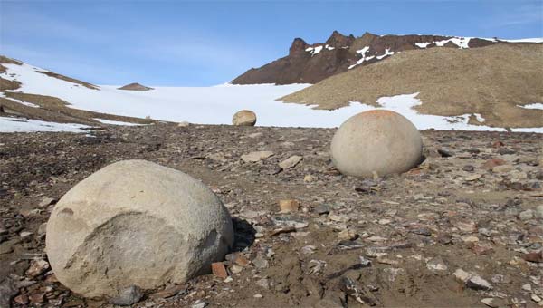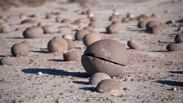2. Шары расположены не в глубине земли, а в открытом доступе на поверхности, лежащие среди множества осколков мелких камней различной неправильной формы.