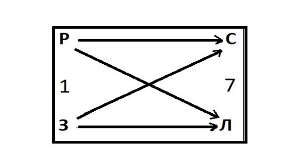 На этой схеме 4 варианта связей между согласными буквами: параллельные (Р – С; З – Л) и крестообразные (Р – Л; З – С). Из этих сочетаний (справа налево) можно составить следующий набор слов: