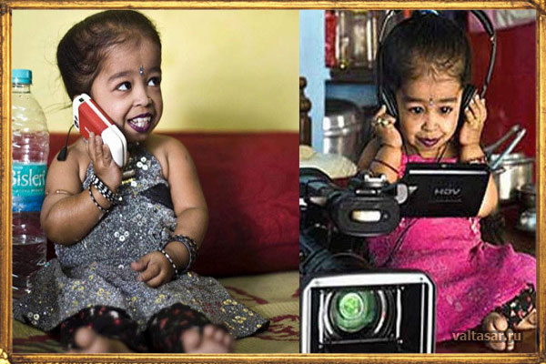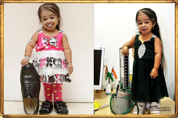 Эта крохотная девочка появилась на свет в 1993 году, и в настоящее время ей уже 20 лет. Зовут ее Джиоти Амге и она родилась в Индии. С раннего детства девочка претендовала на титул самого миниатюрного человека. До этого рекордсменом являлся китаец Хэ Пинпин. Его рост равнялся 74 см. Для сравнения: рост индианки в возрасте 14-ти лет составлял 58 см при весе 5 кг!