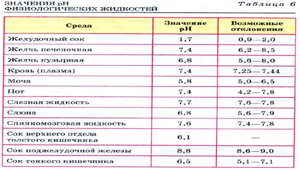 В таблице приведены нормативные значения PH физиологических жидкостей организма. Отметим для себя их значимость, например, для крови норма PH - 7,4. При снижении этого показателя до 7,1 наступает смерть.