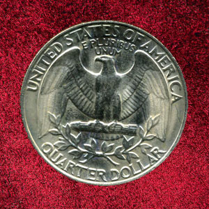 25 центов (США). Это «квотер» или «четвертак» – каждый из 50-ти штатов США выпускает свой собственный. Монетка имеет рифлёный гурт и весит немногим более 5 грамм. Жители штатов самостоятельно выбирают рисунок реверса, окончательный вариант согласуется с правительством.