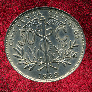 50 сентаво (Боливия). Первые боливийские монеты чеканились исключительно из серебра, их начали изготавливать в 16 веке. Однако вес и проба металла были нестабильными. В результате в 1650 году пришлось провести деноминацию, под присмотром королевского инспектора, которого прислали из Испании.