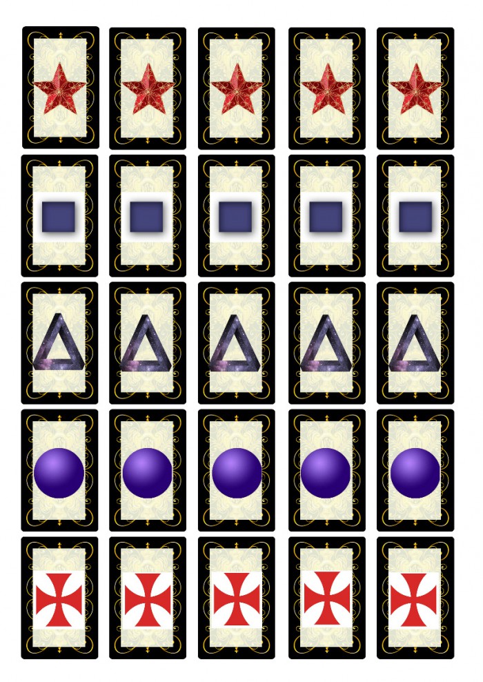 Если у вас нет принтера, то колоду карт можно схематически изобразить от руки (всего 25 штук, по 5 карт с символами «звезда», «квадрат», «треугольник», «круг», «крест»). Картинки рекомендуется наклеить на лист картона, чтобы сделать их более плотными.