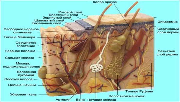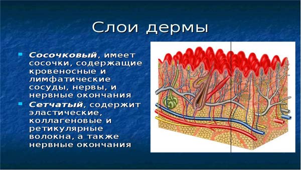 Отметим здесь то, что тело человека на 80% «жидкое» и состоит из молекул воды, а как сказано выше (и показано на рисунке) сосочковый слой кожи пронизан кровеносными капиллярами и лимфатическими сосудам (то есть он водянистый).