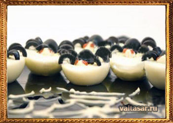 На каждую половинку яйца положите половинку оливки (срезом вниз) – это будет "брюшко" паука. Оставшиеся половинки оливок нарежьте тонкими дольками, имитируя лапки, и приставьте "лапки" к "брюшку". Голову паука можно сделать из капельки майонеза, а глаза – из двух маленьких капель кетчупа. Эта жутковатая, но очень вкусная закуска точно произведет впечатление на ваших гостей!