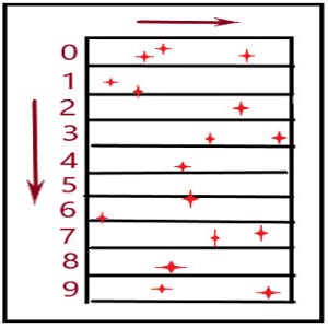 Ключом для перевода узелковых точек в число служит показанный ниже примерный рисунок. Он представляет собой прямоугольник, разделённый на 10 равных частей (сеть для фиксации точек). Все его части обозначены (сверху вниз) цифрами от 0 до 9. См. рисунок.