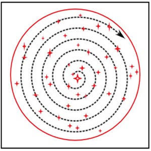 Её начальная точка начинается от находящейся в круге самой большой звезды. См. примерный рисунок. Спираль закручивается по часовой стрелке и заканчивается у самой последней звёздной точки, примыкающей к краю окружности.