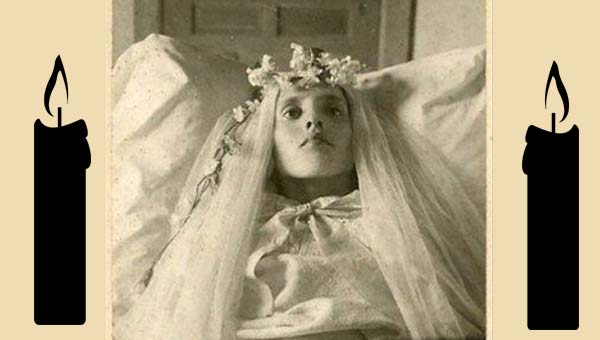 Если умирала молодая девушка, то ее наряжали в платье невесты, укутывали в фату, украшали белыми розами и прочими цветами и фотографировали в таком виде. Чтобы умерший человек сохранял нужную позу для фото (а процесс фотографирования занимал не менее 15-ти минут в то время), его фиксировали на стуле, постели либо прямо в гробу с помощью подушек и других приспособлений.