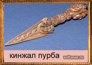 3. Пурба. Ритуальный кинжал, который предназначен для изгнания злых духов. Используют этот предмет следующим образом – совершающий обряд должен наносить кинжалом колющие удары (разумеется, демонам, с которыми он сражается) и произносить при этом мантру «хум».