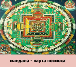 ритуальный предмет, используемый в медитациях. Мандала символизирует чистые земли будд, сферу обитания божественных существ. Обычно мандала представляет собой символ чрезвычайно сложной структуры, который можно интерпретировать как «карту космоса», своего рода модель вселенной.