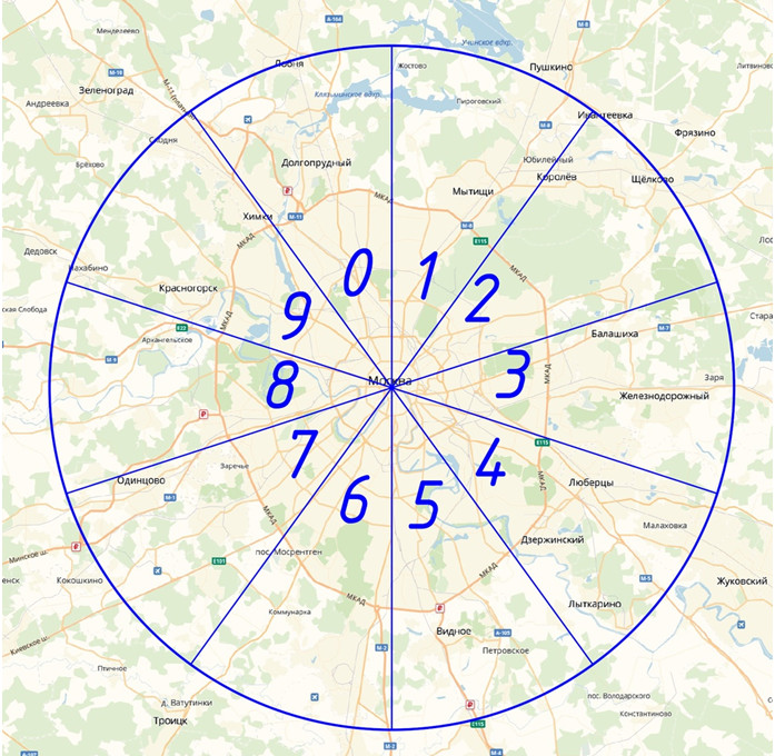 Я поставил перед собой цель: с помощью разработанной методики найти в нём неизвестную цифровую информацию. На протяжении 800 лет она формировалась на территории центральной России многими поколениями людей. Для этого на карте я начертил окружность (центр г. Москва) с радиусом 158 км. Эту крайнюю точку окружности определило расстояние г. Серебряные Пруды до Москвы. В круг площадью 78387 кв. км. вошли 47 городов Подмосковья. Окружность на карте разделил на 10 секторов и обозначил их цифрами от 0 до 9. Линия между секторами 0 и 1 направлена на север. Примерный вариант этой методики показан на карте.