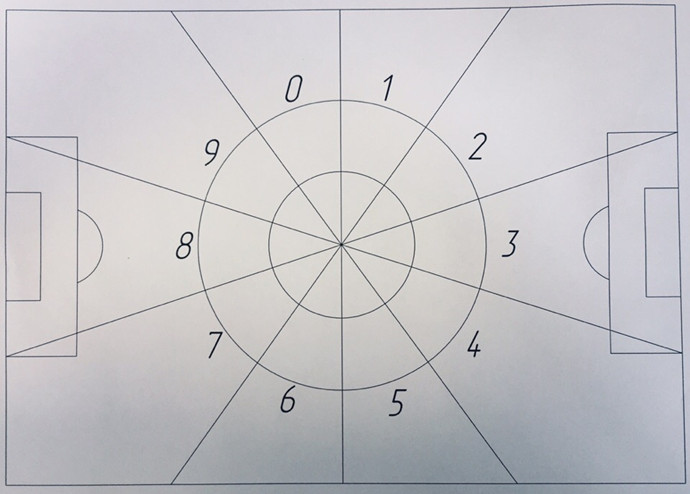 Подобная запись игры позволит определить по порядку номера секторов, по которым мяч катился или ударял. К этим знакам прикрепляются личные номера футболистов, которые владели мячом в данных секторах или передавали его другому игроку. Каждое число можно расшифровать и прочитать скрытую в нём информацию, составленную ногами футболистов. При этом цифровой "рисунок" игры и содержание полученного текста, никогда не будут повторяться.