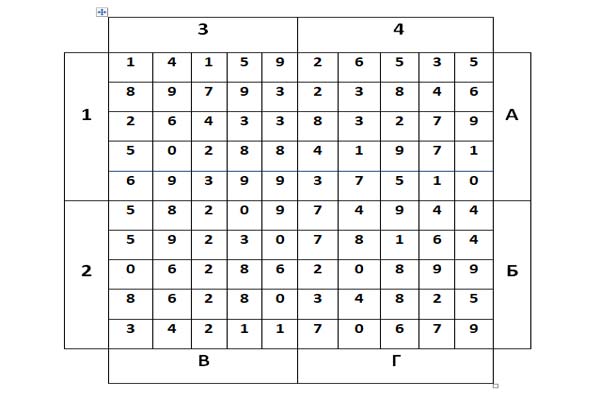 Текст, скрытый в числе, расшифровывается в любом направленииего построения. Если расшифровать все 13,3 триллиона цифр в обратном порядке (от последней цифры к запятой), то получится отражение ещё одного параллельного мира, только в другом варианте. Например, в первой тысяче цифр после запятой на отрезках из 50 знаков, мною было выявлено 20 картин реальной жизни людей и явлений природы.Разместим в клетках квадрата (10 Х 10) первые 100 цифр числа Пи после запятой (см. схему). В нём 4 блока по 50 знаков каждый по горизонтали и вертикали:1 А; 2Б; 3В;4Г. И все цифры в обратном порядке: А1; Б2; В3; Г4. При расшифровке всех блоков этого небольшого квадрата получится 8 реальных картин.