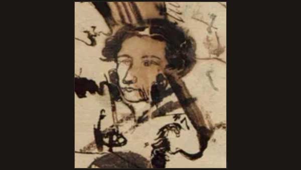 Этот же вид птицы я обнаружил на автопортрете самого Пушкина. С него на рисунке начинается чёрная полоса. Мне удалось отыскать снимок декабристов с более прозрачным цветом. Я повернул портрет Пушкина против часовой стрелки на 90 градусов и увеличил его. На его левой щеке была обнаружена чёрная птица с клювом, смотрящая в другую сторону. Она была замаскирована под его бакенбарды. Ниже птицы я обнаружил замазанную темноватой жидкостью дату. По еле заметному теневому выделению цифр я определил 1837 г. На неё указывает стрелка. См. рисунок: