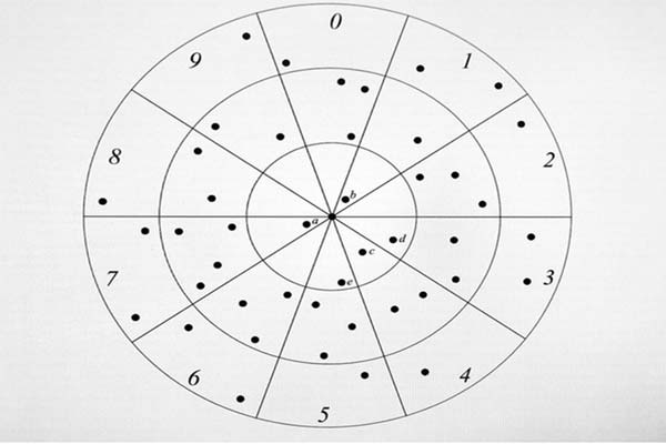 В отличие воды лес имеет более разнообразное информационное поле. Язык леса далеко не один. Его перевод и расшифровка требуют специальных методик. Например, для считывания информации с участка леса, нетронутого человеком, лучше подходит метод большого круга диаметром не менее 40 метров. Для его центра нужно выбрать самое старое и высокое дерево. Вокруг его с помощью шнура (радиус 20 м.) определить пределы круга и разделить его на 10 секторов с цифрами, закрепить нулевой сектор круга в направлении севера. При этом радиусе длина дуги каждого сектора получится примерно 12,5 метра (40х3,14: 10). В этом круге точки нахождения и роста каждого дерева заранее определила природа. Цифровую запись внутри круга будут определять два показателя: очерёдность удаления деревьев от центра и распределение этой очерёдности по 10 секторам.