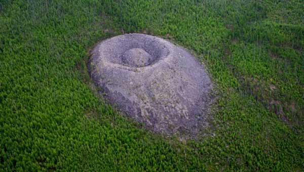 Рис. 1 «Патомский кратер» на склоне сопки, покрытой лесом. Вид с юго-западной стороны. Снимок с вертолёта. (Картинка из свободного доступа в Интернете).