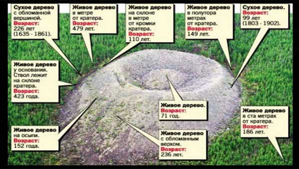 Вокруг кратера исследователи нашли много лиственниц с механическими повреждениями. В стволе одной обнаружили даже дырку от камня.