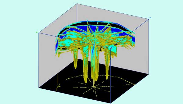 Картинка представляет разрез (по профилям прохода георадарной ленты). Если бы проходов георадара было больше, то результат был такой же. Потому что о наличии в шахте кратера разреженной по плотности породы, состоящей из колотых камней, можно было сказать и без георадарного зондирования. Шахта пуста. Кроме насыпи колотых камней, в ней ничего нет.